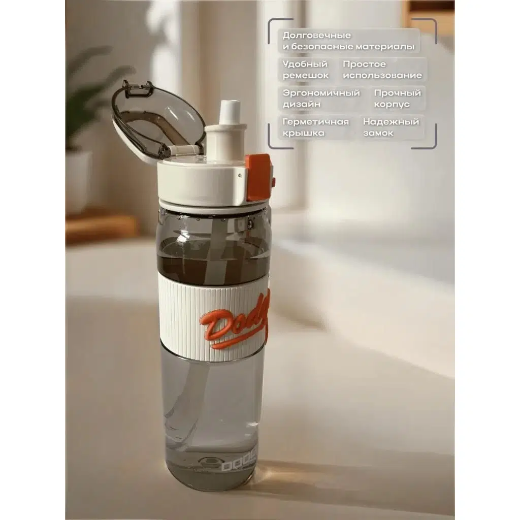 Dodge Su Matarası Tritan Silikon Kemerli, Şeffaf Kilitli Kapaklı, Sızdırmaz, Dayanıklı, Hafif, BPA İçermeyen Su Şişesi Beyaz 850Ml